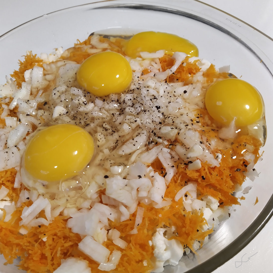 6. Riko kananmunat vuokaan ja sekoita tasaiseksi.
