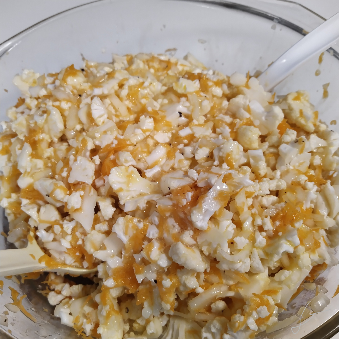 2. Leikkaa kukkakaali pieniksi paloiksi ja raasta porkkanat.