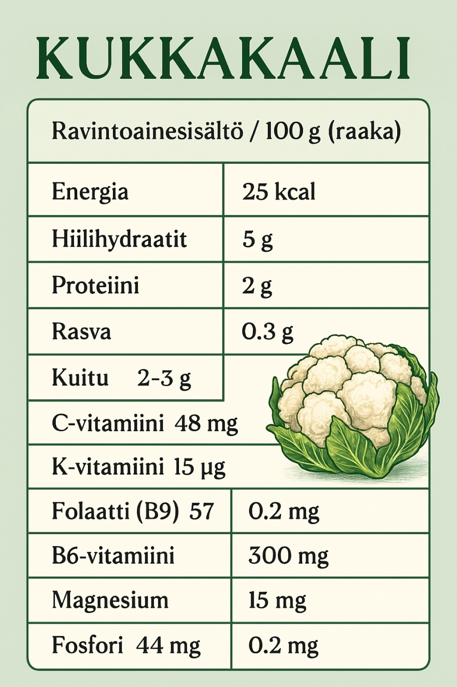 • Folaattia (B9): 14 % – tärkeä solujen uusiutumiselle