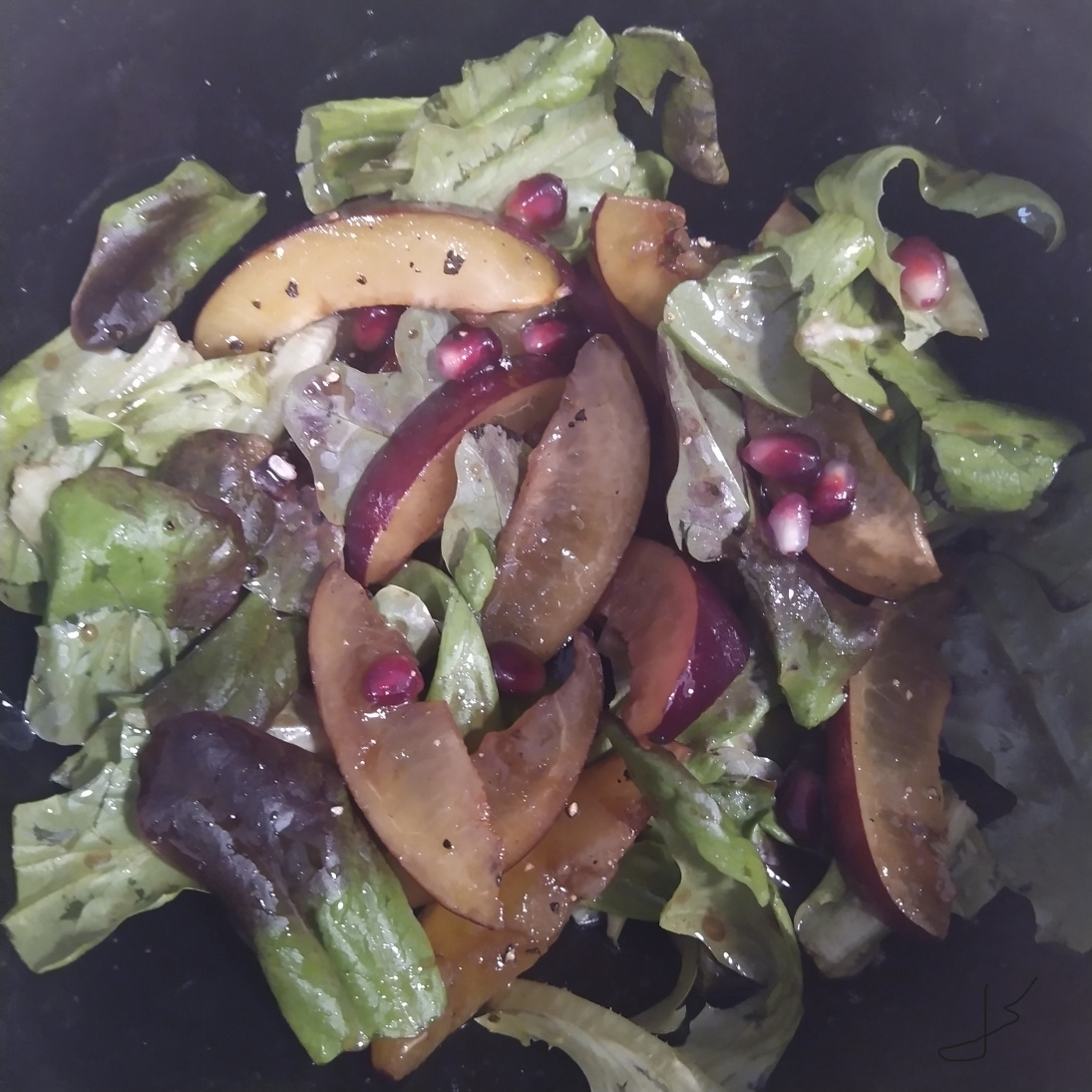 Salaattia, kurkkua, tomaattia, saksanpähkinöitä Kastike: