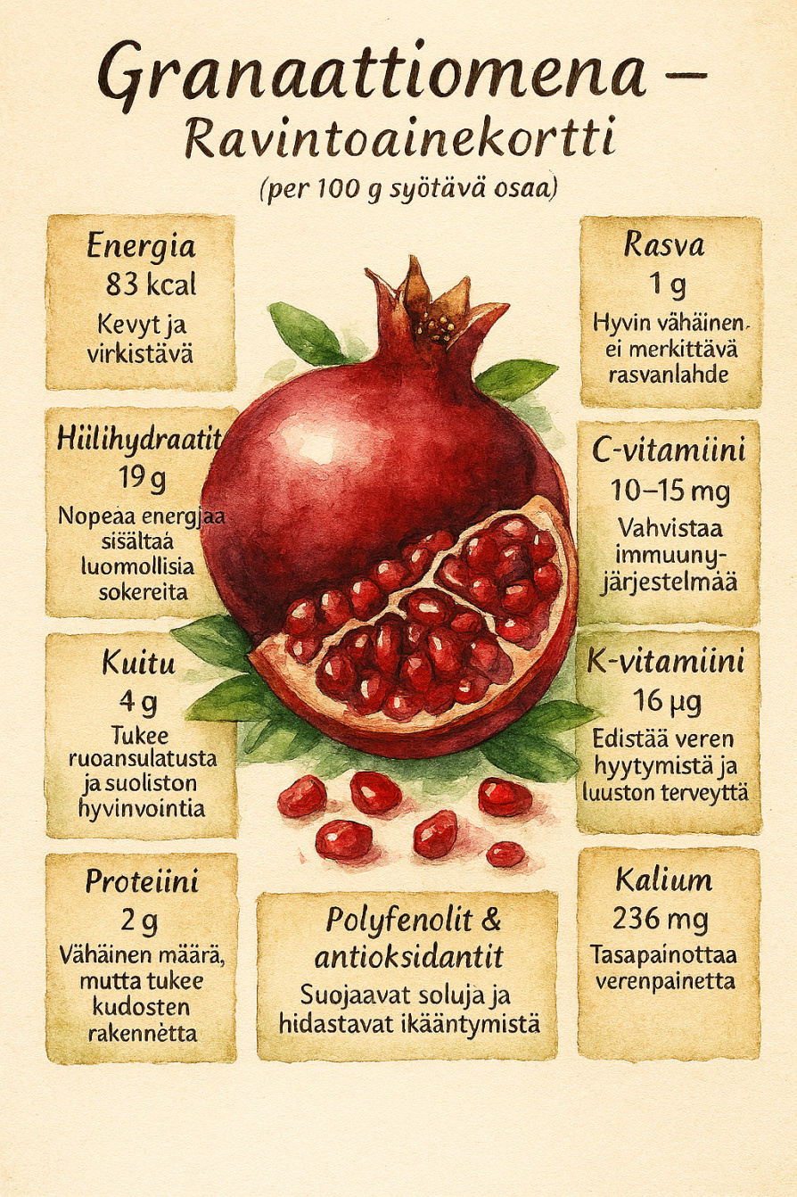 • Granaattiomenan siemenet (arillit) sisältävät mehukkaan ytimen ja kuitupitoisen kuoren – molemmat syötäviä.