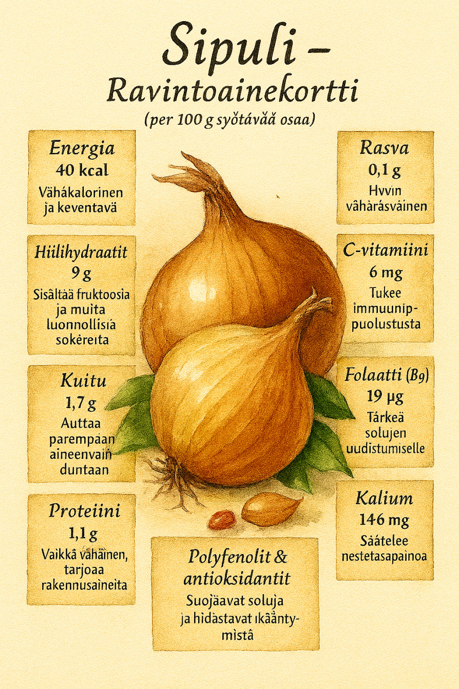 • Kypsennetty sipuli on miedompi ja helpompi sulattaa, mutta osa ravinteista heikkenee.