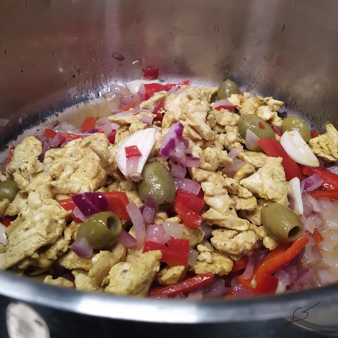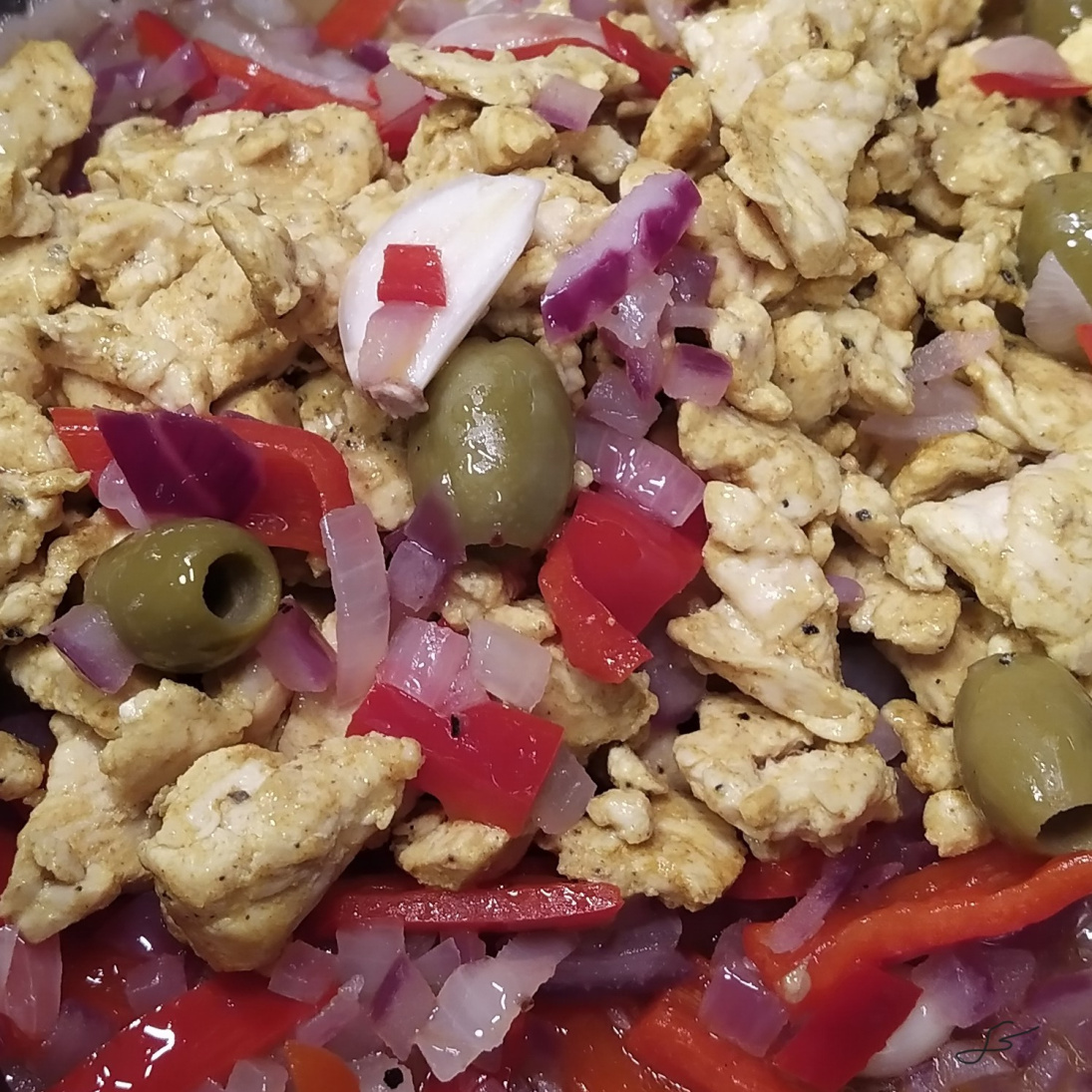 Lisää suikaloitu chili ja paprika sekä oliivit. Sekoita ja anna kasvisten pehmetä hetki.