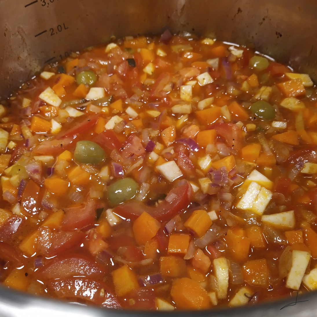 Lisää pieni määrä pilkottuja suolakurkkuja, muutama oliivi ja liraus punaviinietikkaa sekä vettä. Anna hautua hetken miedolla lämmöllä.