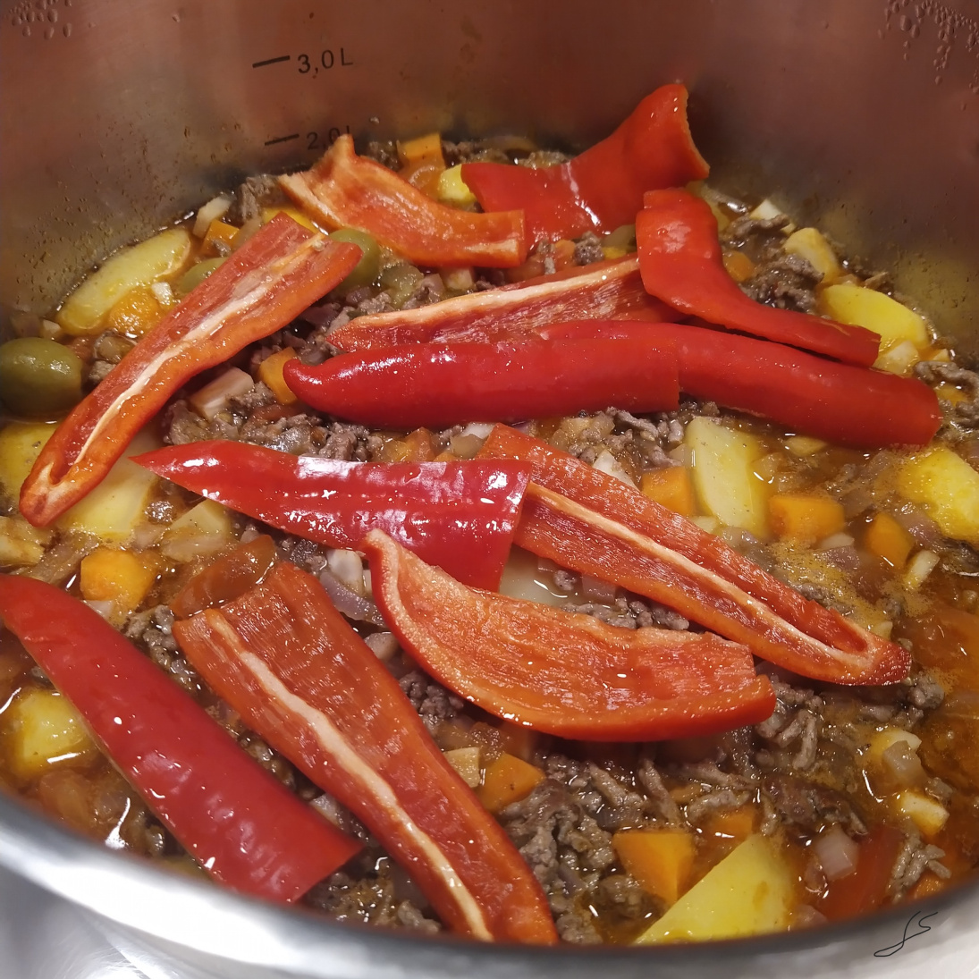Tarkista nestemäärä ja suola, lisää pilkotut perunat ja isoiksi siivuiksi leikatut paprikan palat.