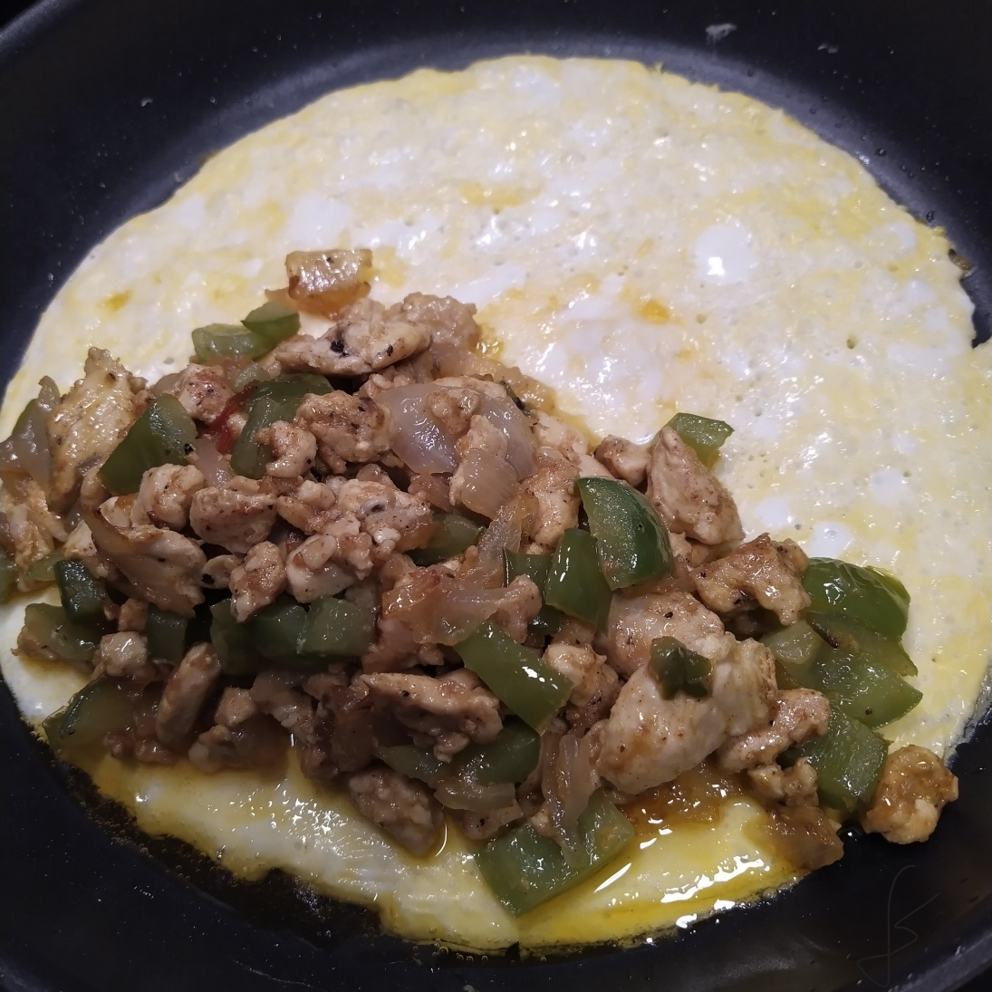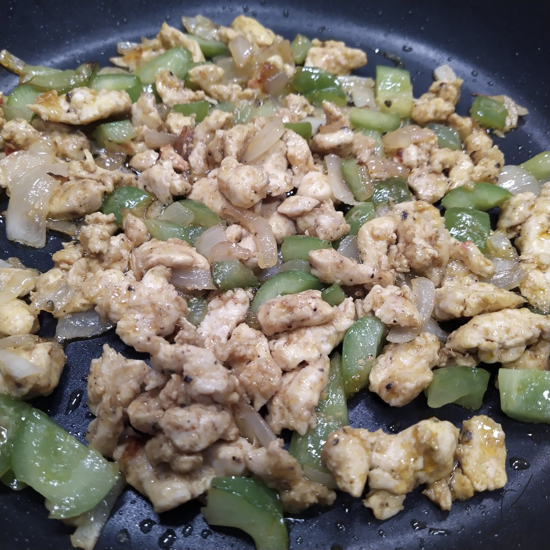 Kuullota rypsiöljyssä sipulit, lisää pilkotut vihreät paprikat ja valmiiksi kypsennetyt chilillä maustetut broileripalat.