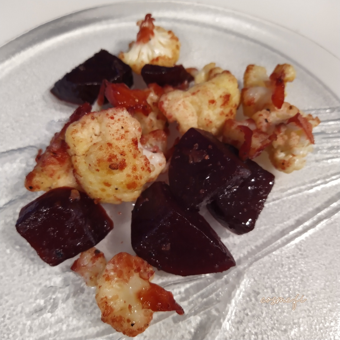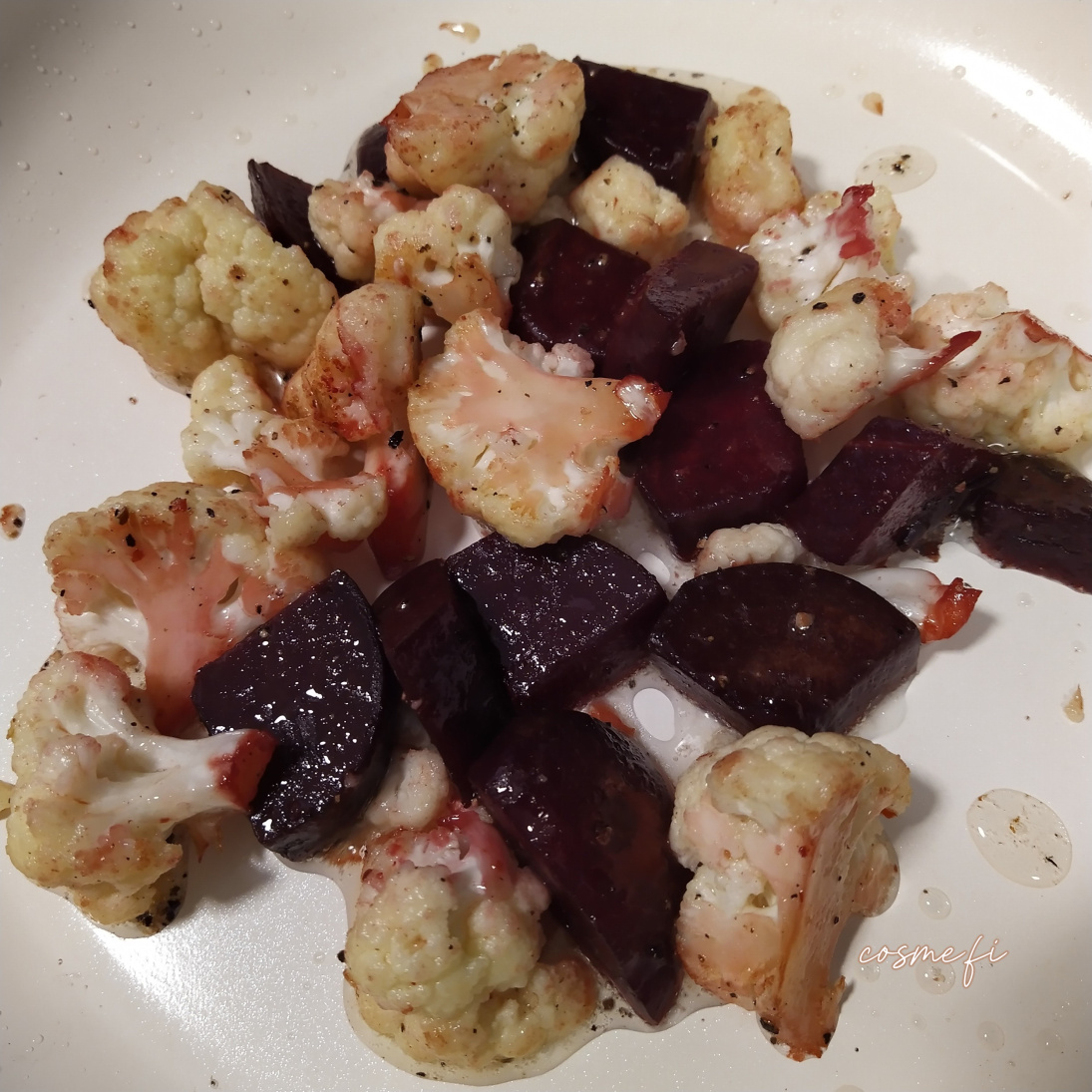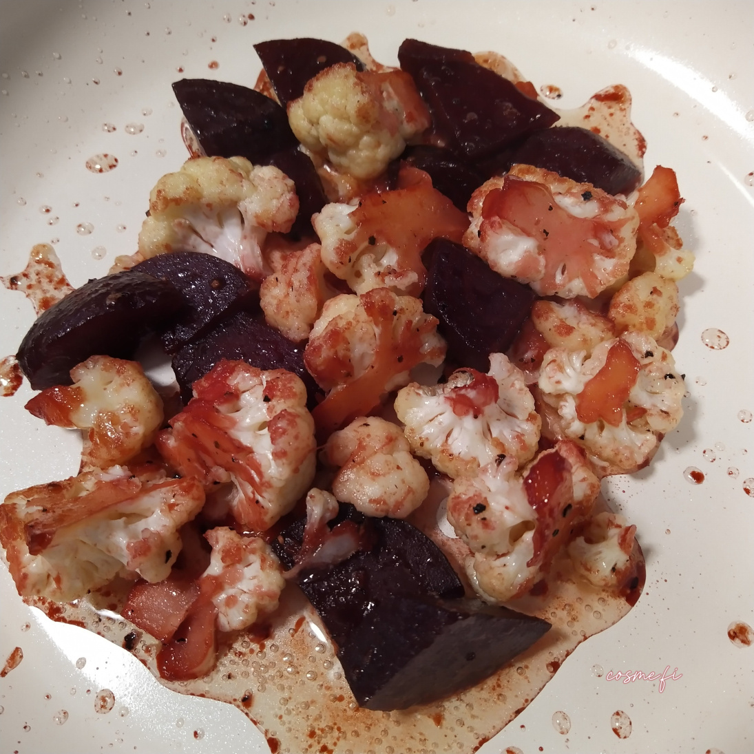 Fräs blomkål och kokt rödbeta i rapsolja på låg värme. Krydda med svartpeppar (och salt). Koka upp och tillsätt Campari.