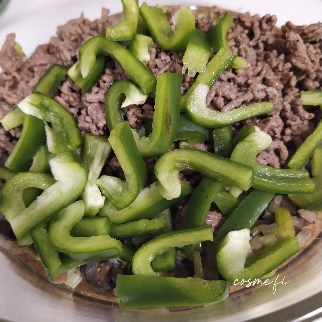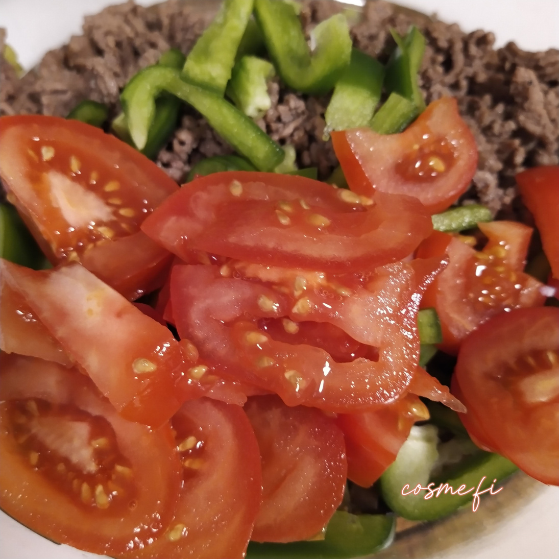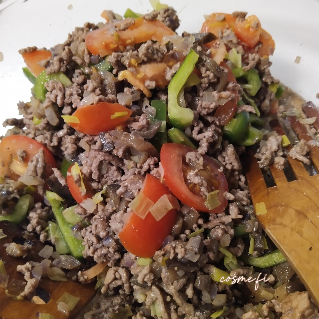 Ruskistettu jauheliha, vihreä paprika, tomaatti