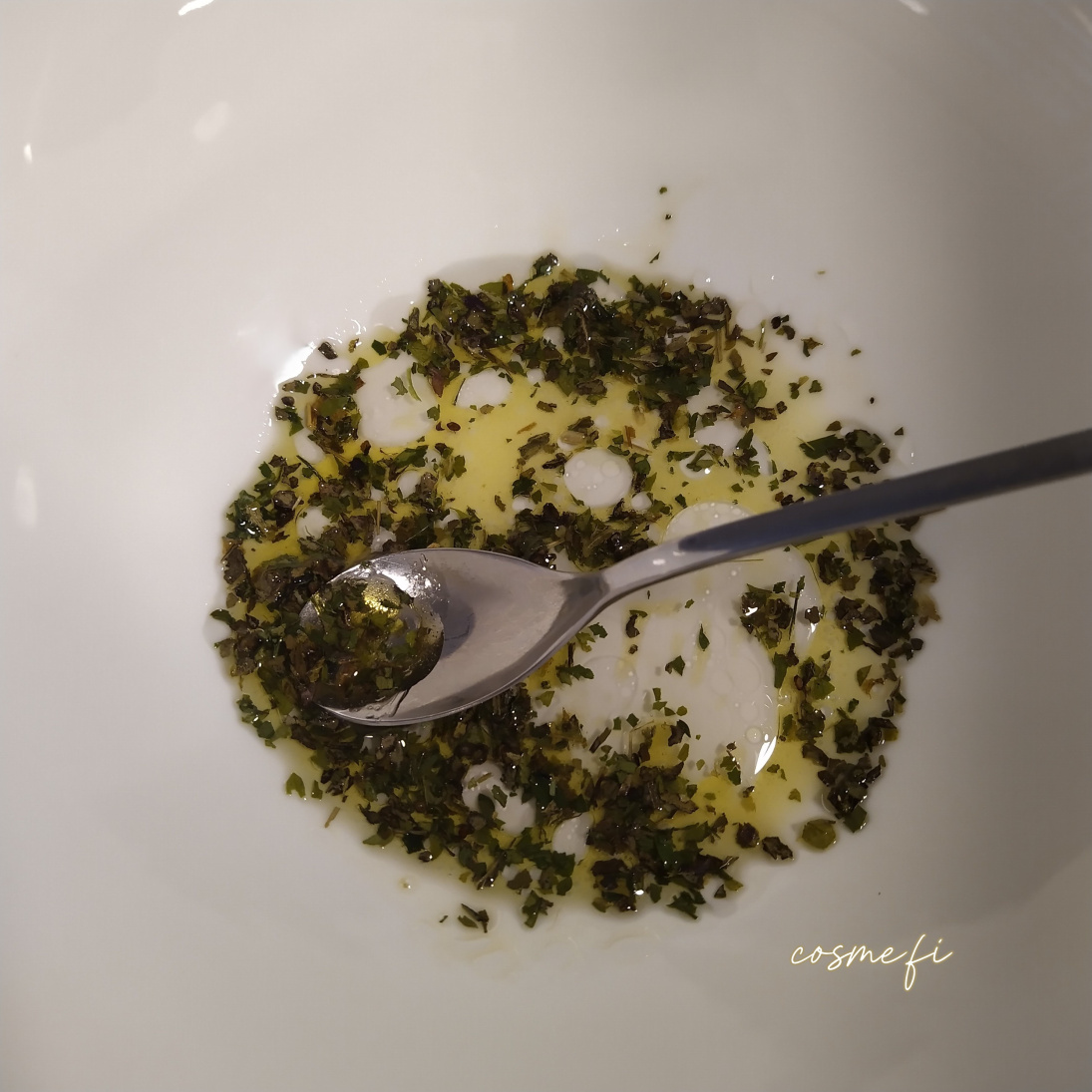 Extra neitsytoliiviöljy, valkoviini, persilja, basilika, mustapippuri