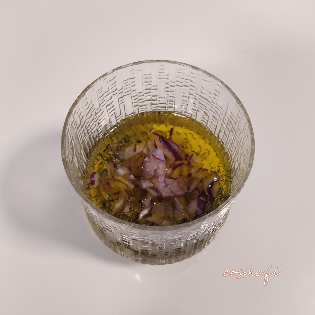 Extra neitsytoliiviöljy, tilli, mustapippuri, sipulisilppu