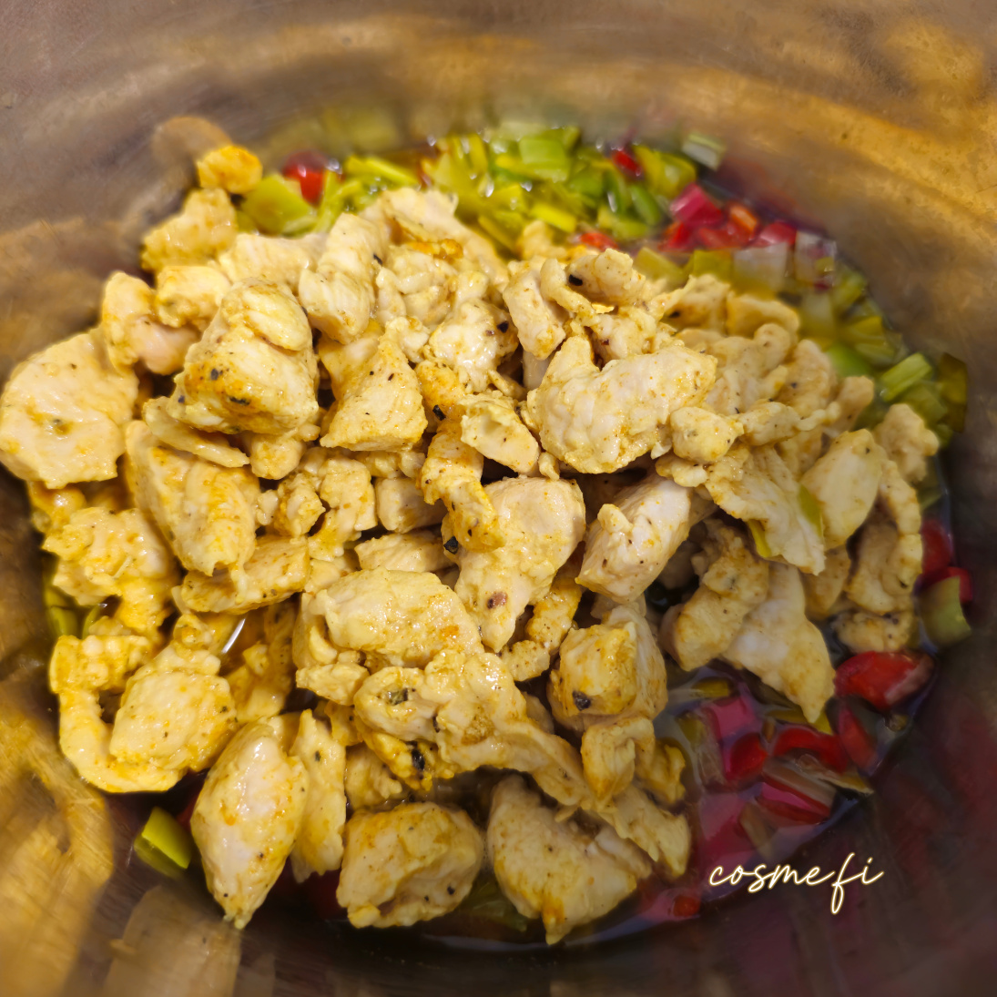 Rypsiöljy, purjosipuli, chili, broileri, curry, mustapippuri, suola, tumma rommi, vesi, omena