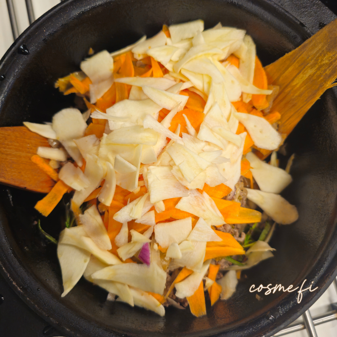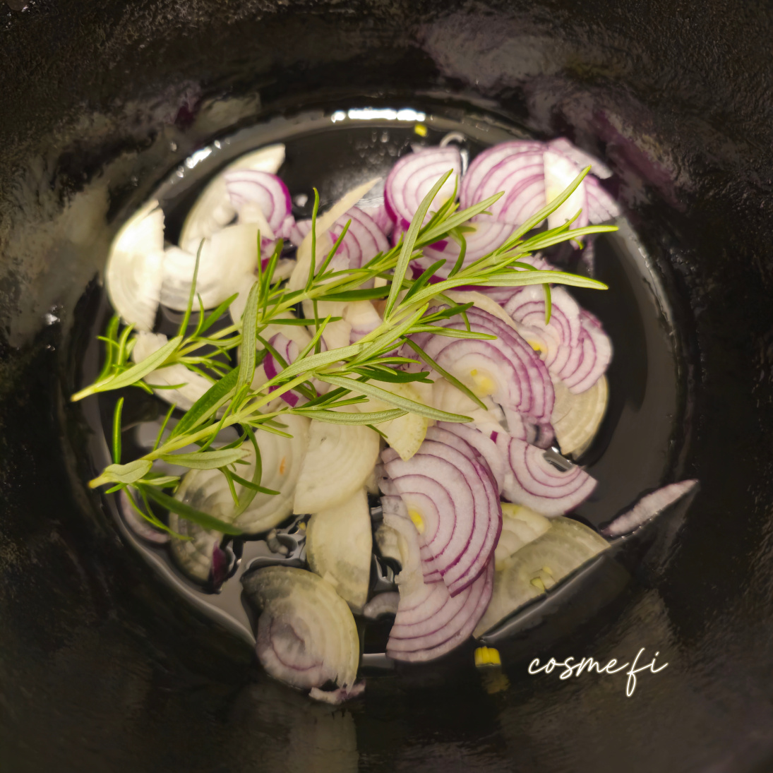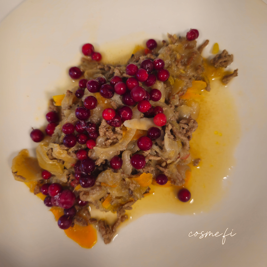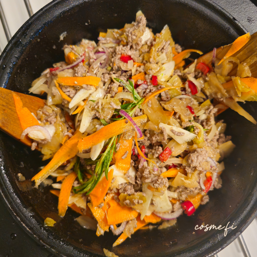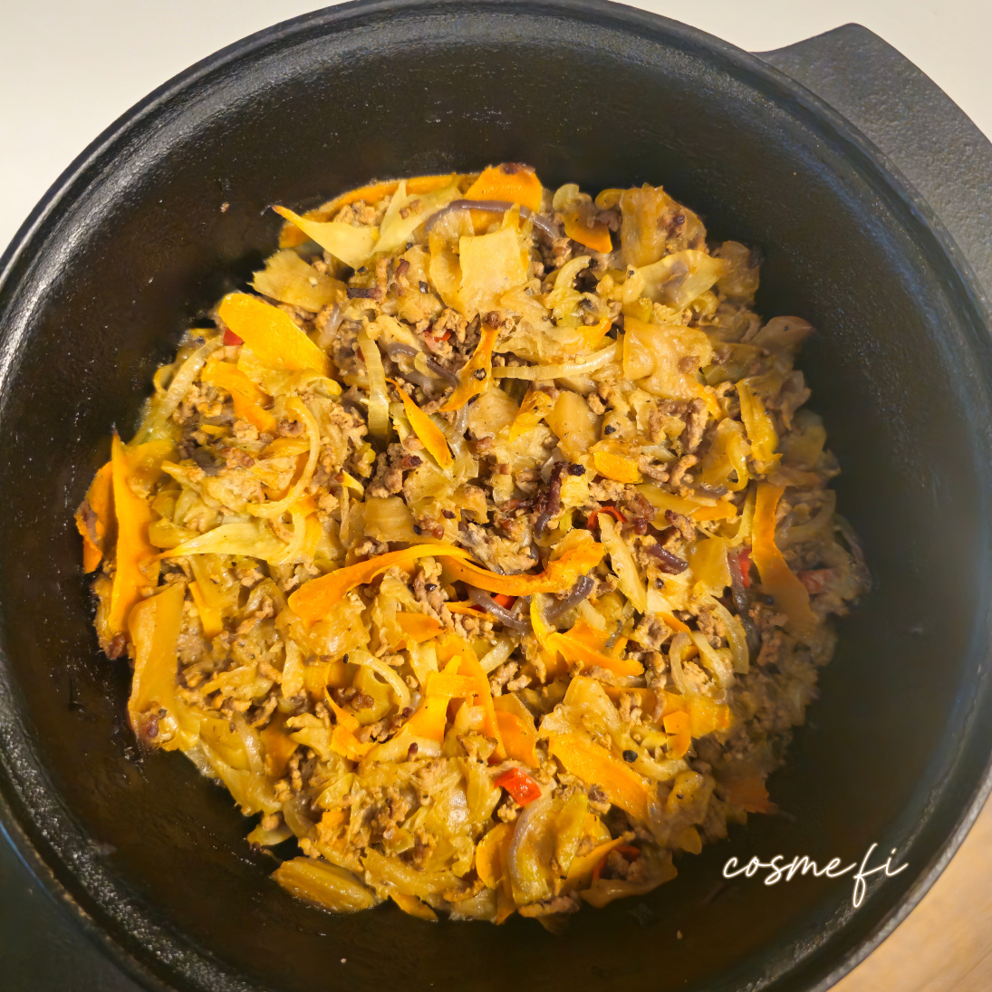 Kaalipata-ainekset: Rypsiöljy, keltasipuli, punasipuli, rosmariini, mustapippuri, kaali, tumma siirappi, jauheliha, mustapippuri, suola, porkkana, palsternakka, chili, vesi