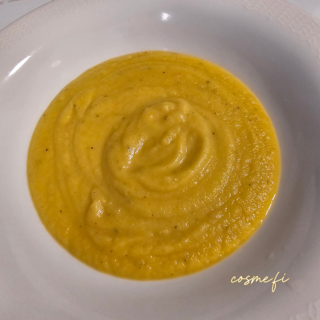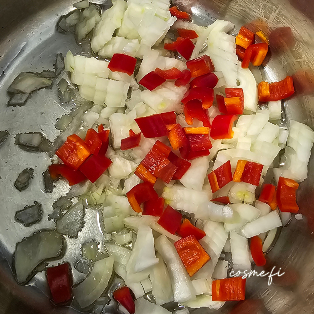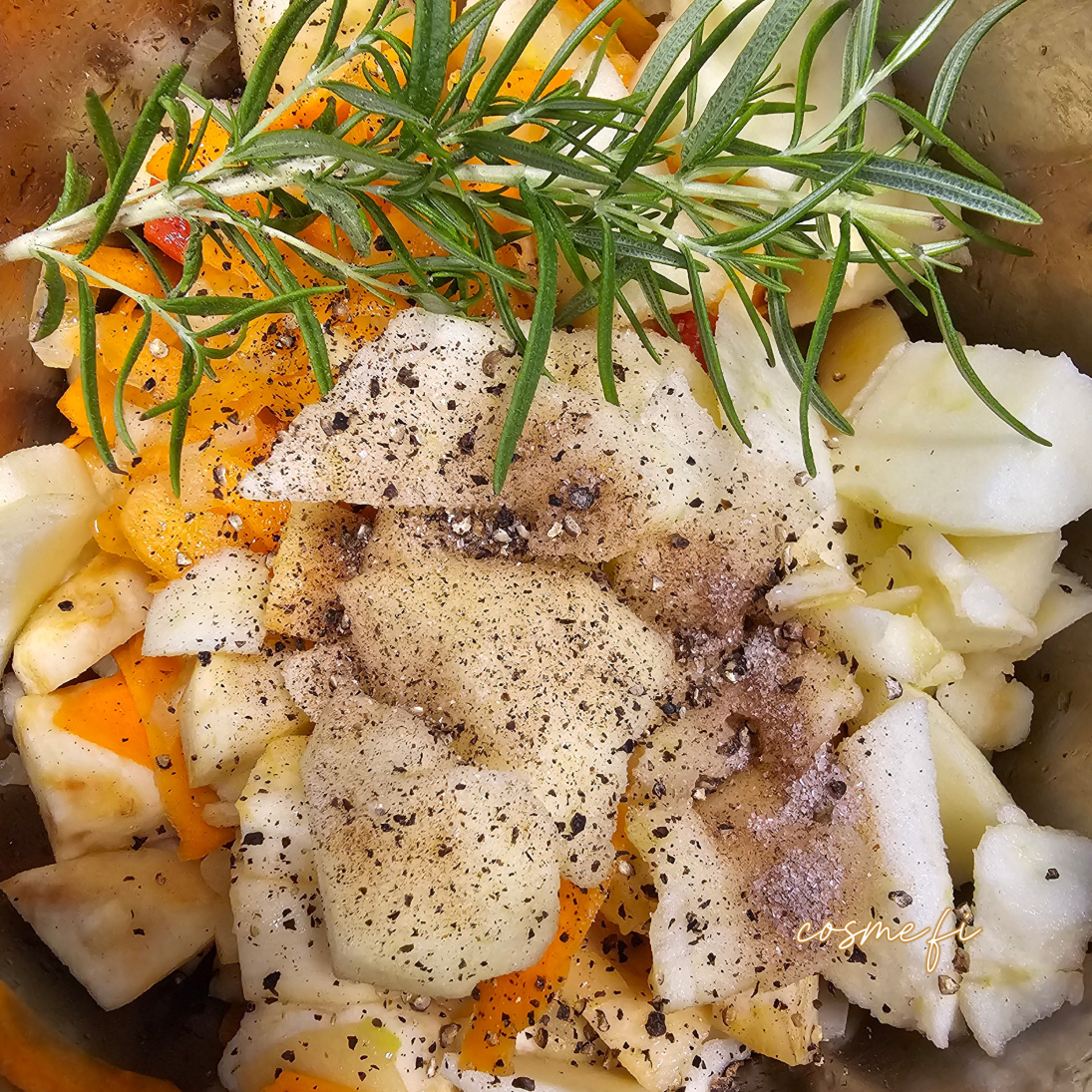 Rypsiöljy, keltasipuli, chili, juuriselleri, palsternakka, porkkanalastut, omena, kaneli-sokeri, rosmariini, mustapippuri, perunat, suola.
