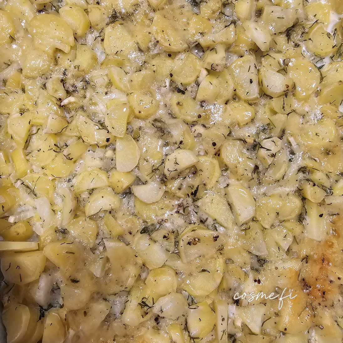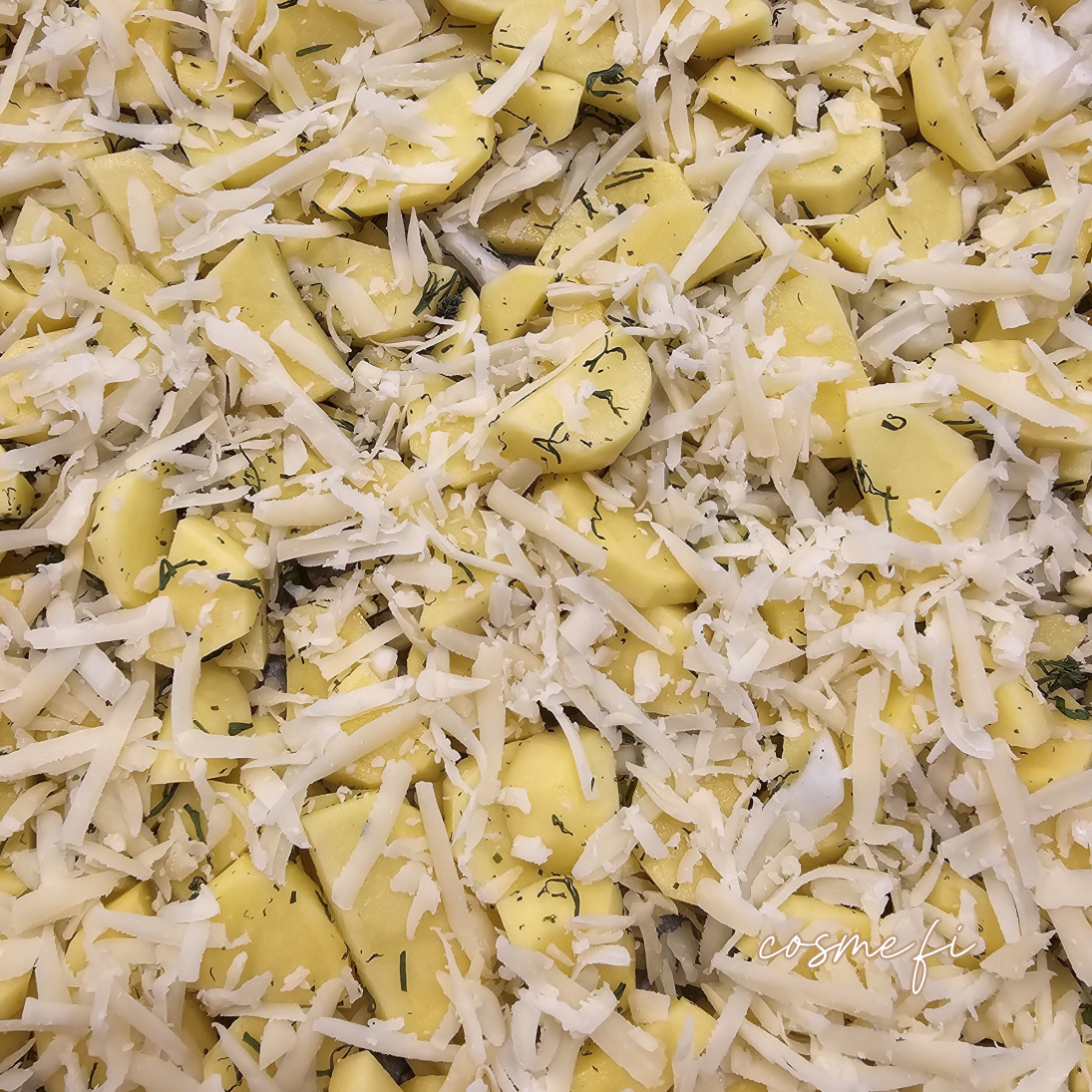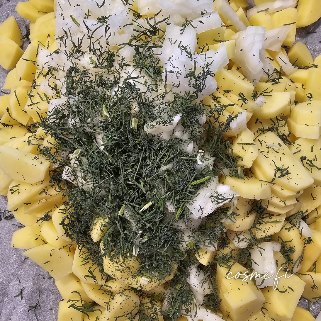 Valkosipuli, sipuli, mustapippuri, suola, tilli, juustoraaste, "Siri-kerma"= rasvaton maito + rypsiöljy